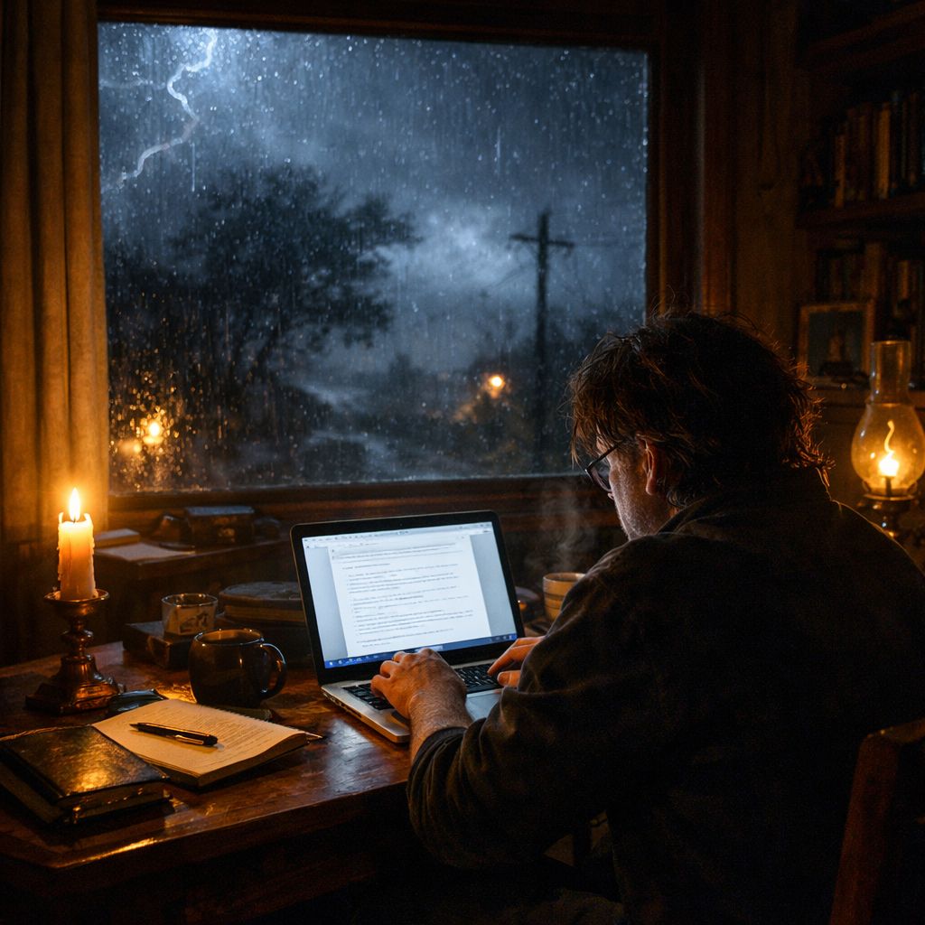 I lit a candle and opened my MacBook, which still had 91% battery left—so I had at least 12–16 hours of juice in my trusted companion. I connected it to my iPhone for a 5G connection and set up a hotspot. The wind was howling, slashing down like in catastrophe movies, and the power outage made me feel alone in my world of words, surrounded by climate change.